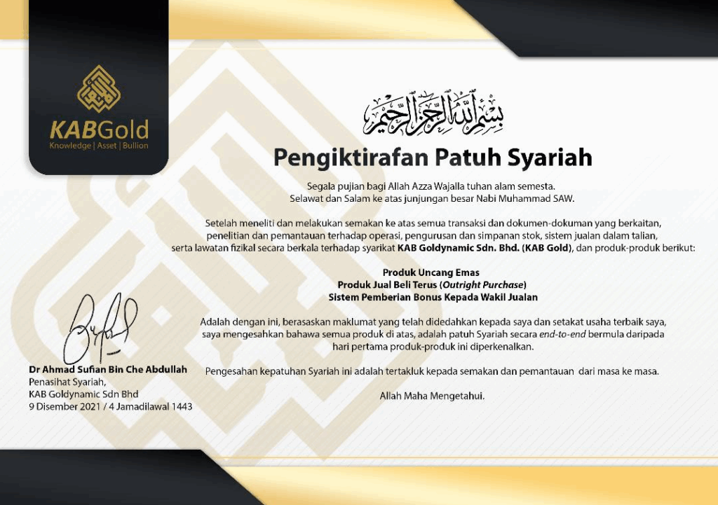 KAB Gold merupakan syarikat jual beli emas 100% milik bumiputera yang diiktiraf dan dipantau ketat dari masa ke masa oleh Penasihat Syariah Dr. Ahmad Sufyan Che Abdullah.
