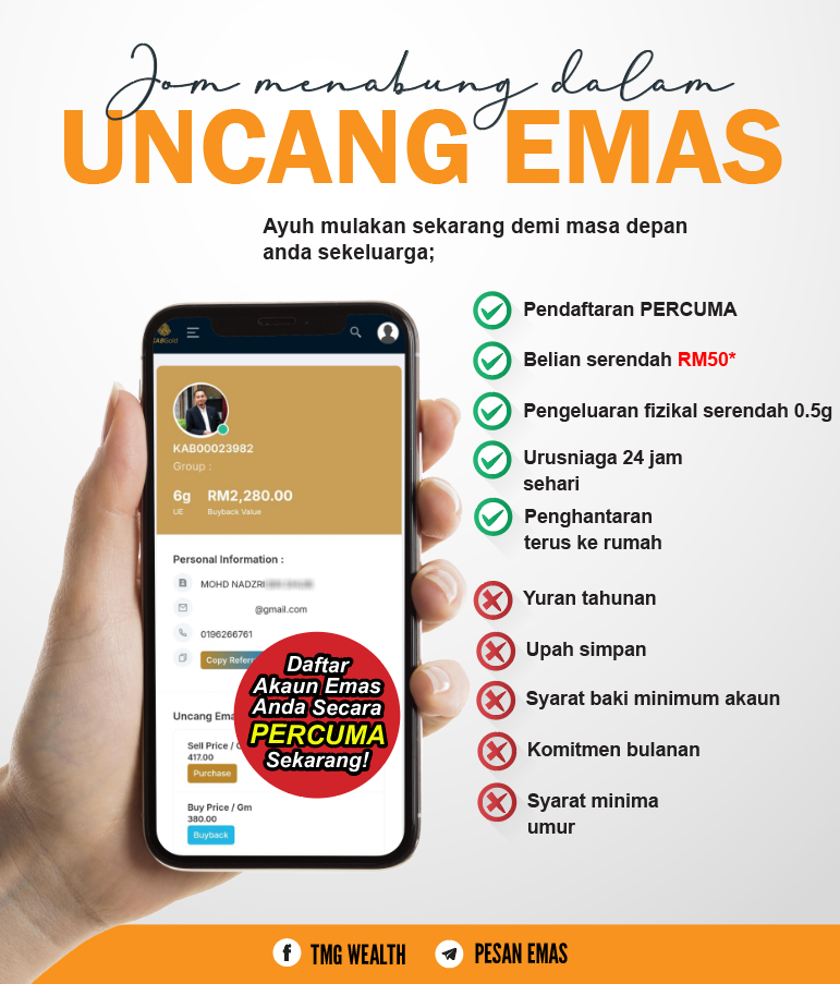 TMG memudahcara simpanan emas anda yang sesuai dengan semua peringkat usia. Dengan hanya serendah RM50, anda boleh mula menyimpan emas dan mengeluarkan emas fizikal pada bila-bila masa. Harga dikemas kini secara harian, tanpa markup tersembunyi. Segalanya fleksibel: simpanan emas boleh jual semula, produk emas boleh dipajak di ar-rahnu, dan jaminan belian semula oleh KAB Gold. Emas bukan sekadar simpanan, tapi perlindungan nilai jangka panjang yang kalis inflasi — dibimbing oleh pasukan berpengalaman dalam komuniti yang menyokong perjalanan kewangan anda.